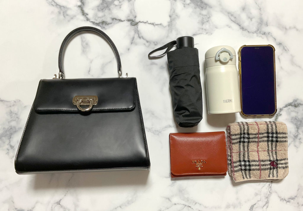 最低限必要な持ち物は、水筒、財布、ハンカチ、スマホ、晴雨両用傘で、これ以上は減らせません。