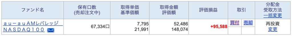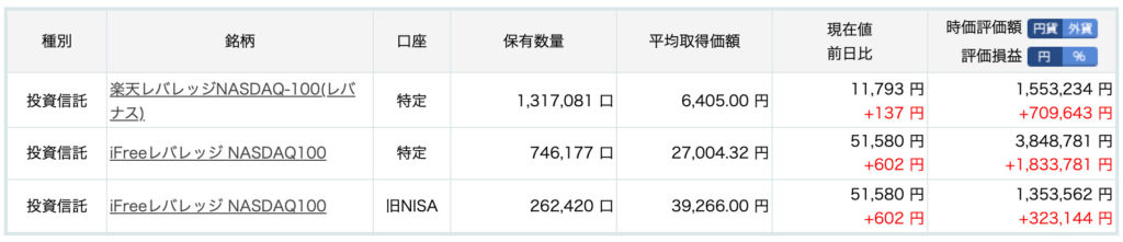 ただし、含み益率では2倍レバのauレバナスに負けています。auレバナスが最安値圏で購入できたからとはいえ、これをみると3倍レバの威力をまだまだ発揮できていませんね。