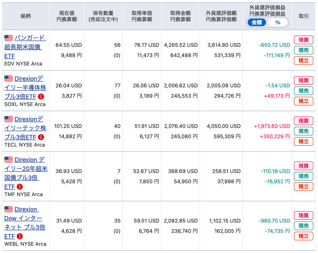 | TECL | 245,080円 | 595,309円 | +142.90%(ドル建てで+95.05%) |