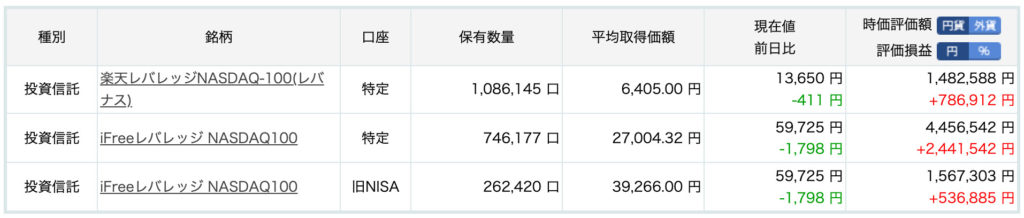 以前は、NISAレバナスは全売却の予定でしたが、特定レバナスと同じ投信なので、いずれは1つにまとめられることを考えて、そのまま保有することにしました。長期的には、保有する投信の種類はできるだけ少なくシンプルにしておきたいというのもあります。