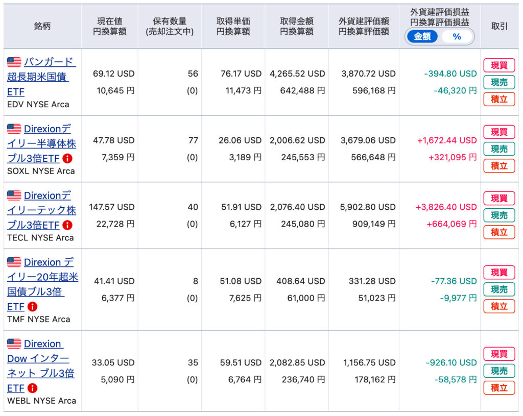 | SOXL | 245,553円 | 566,648円 | +130.76%(ドル建てで+83.35%) |