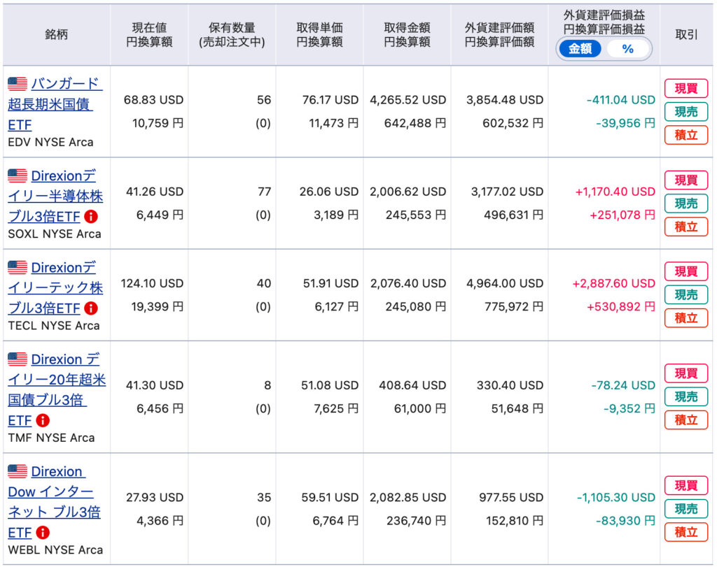 | SOXL | 245,553円 | 496,631円 | +102.25%(ドル建てで+58.33%) |