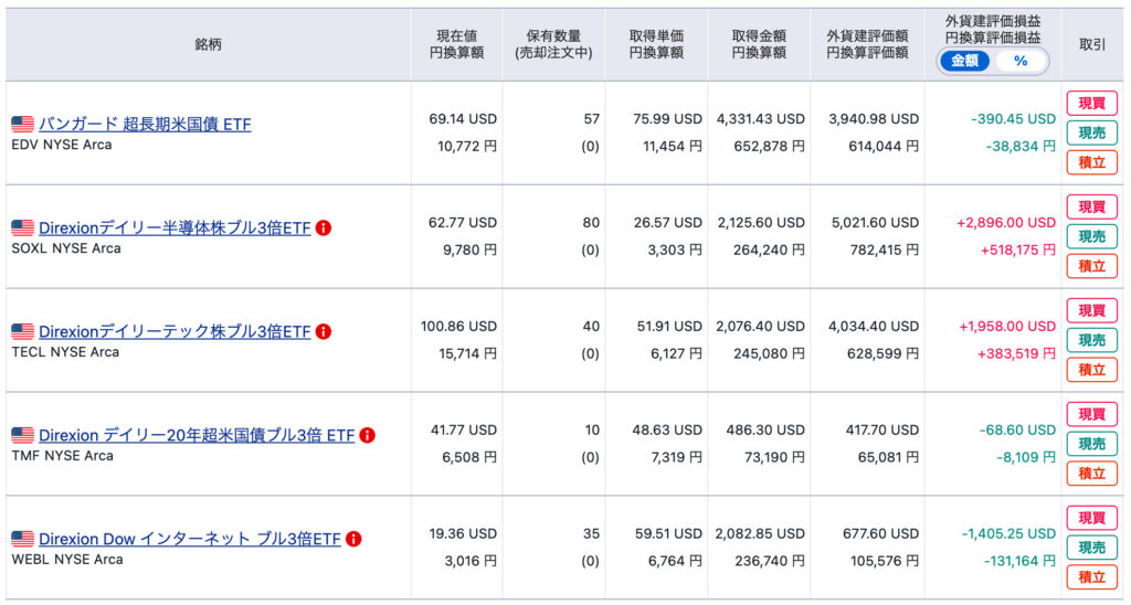 | SOXL | 264,240円 | 782,415円 | +196.10%(ドル建てで+136.24%) |