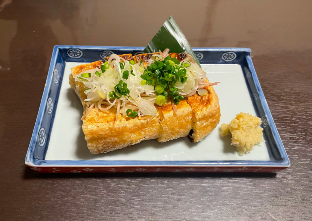 油揚げ以上厚揚げ未満という感じで、豆腐部分は薄くて表面がパリッと香ばしくなっています。